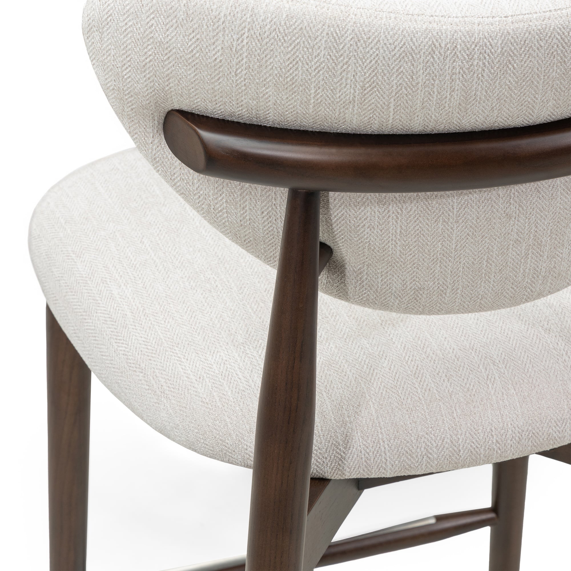 DOMENICO-barstolen kombinerer moderne estetikk med funksjonalitet og komfort. Det polstrede setet i beige nyanse tilfører en varm og innbydende følelse, mens den ask-fargede trefoten gir stolen et naturlig og tidløst preg.