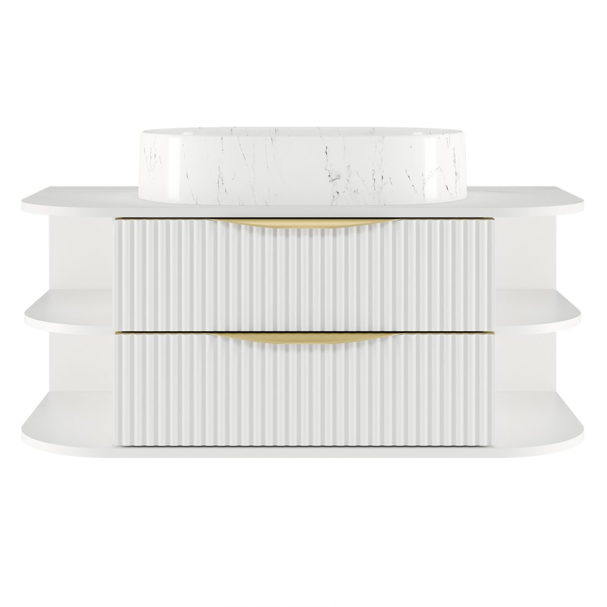 Novea servantskap kombinerer moderne design med luksuriøse detaljer. Med riflete fronter, avrundede åpne hyller og eksklusive gullhåndtak tilfører det badet ditt stil og varme. Topplaten i Bianco marmordekor har hvit kantlist som er limt med fuktbestandig PUR-lim – både vakkert og holdbart.