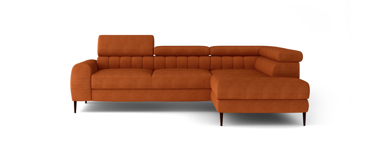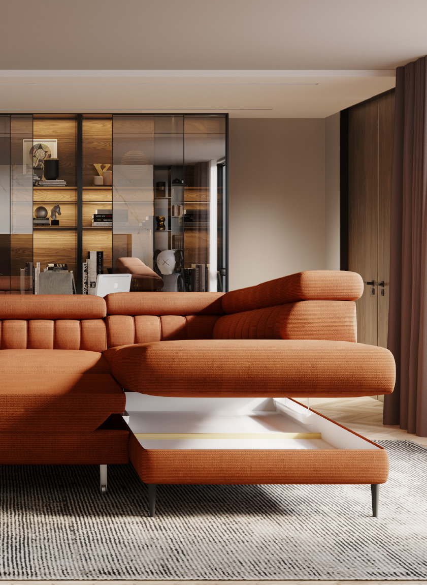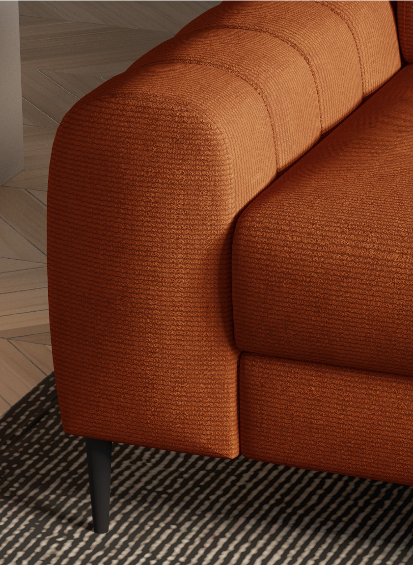 Navas L er en funksjonell hjørnesofa som kombinerer moderne design med maksimal komfort og praktiske løsninger. Den L-formede konstruksjonen leveres både høyre- og venstrevendt, og den stilrene silhuetten fremheves av vertikale sømmer langs ryggstøtten. Sofaen er ideell for både avslapning og overnatting, takket være den integrerte sovefunksjonen og det romslige oppbevaringsrommet i sjeselongen.