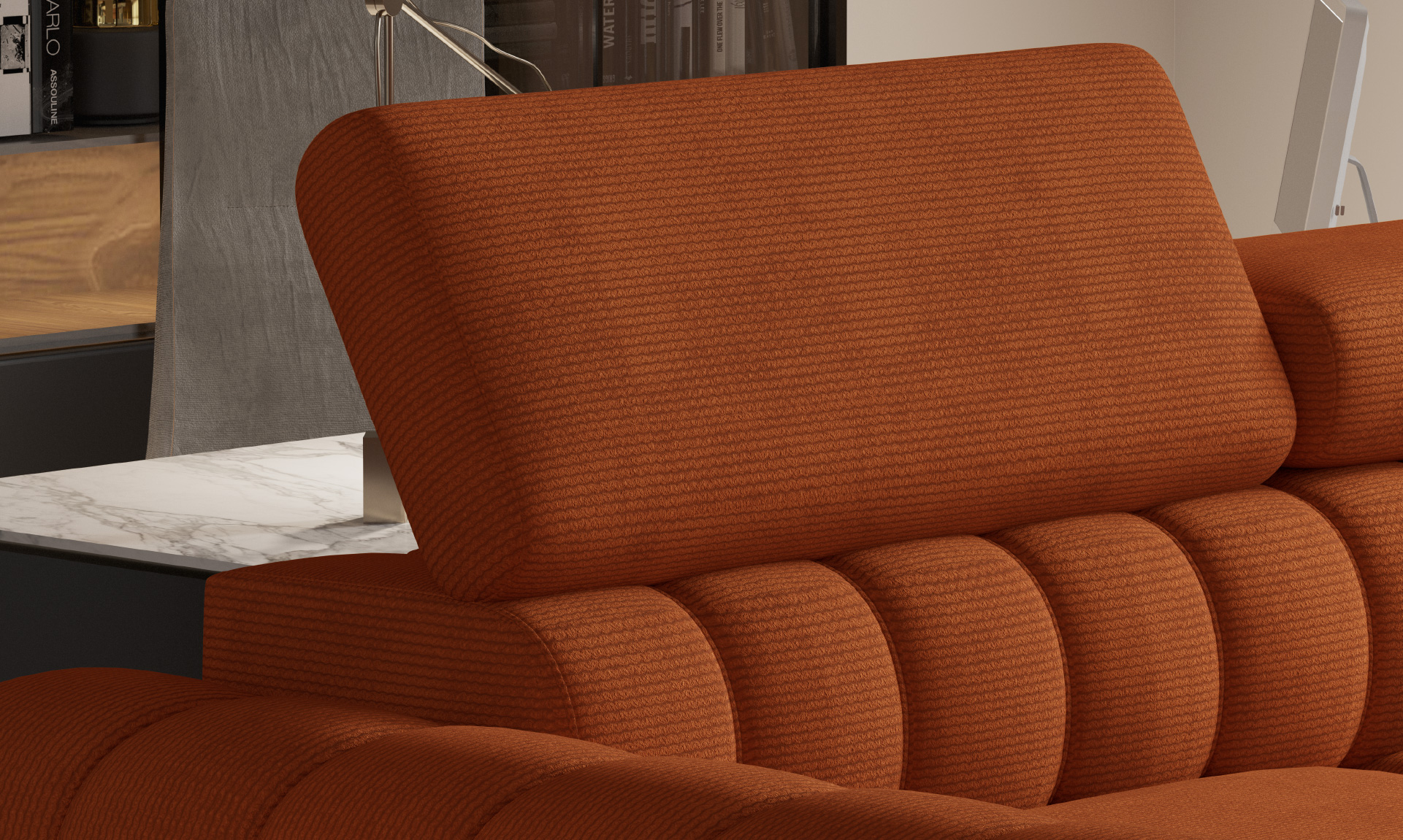 Tre uavhengige, justerbare nakkestøtter gir personlig støtte til nakke og hode, og den oppfellbare sovefunksjonen i delfin-stil gjør det enkelt å forvandle sofaen til en behagelig seng (115×191 cm) – perfekt for både gjester og hverdagsbruk.