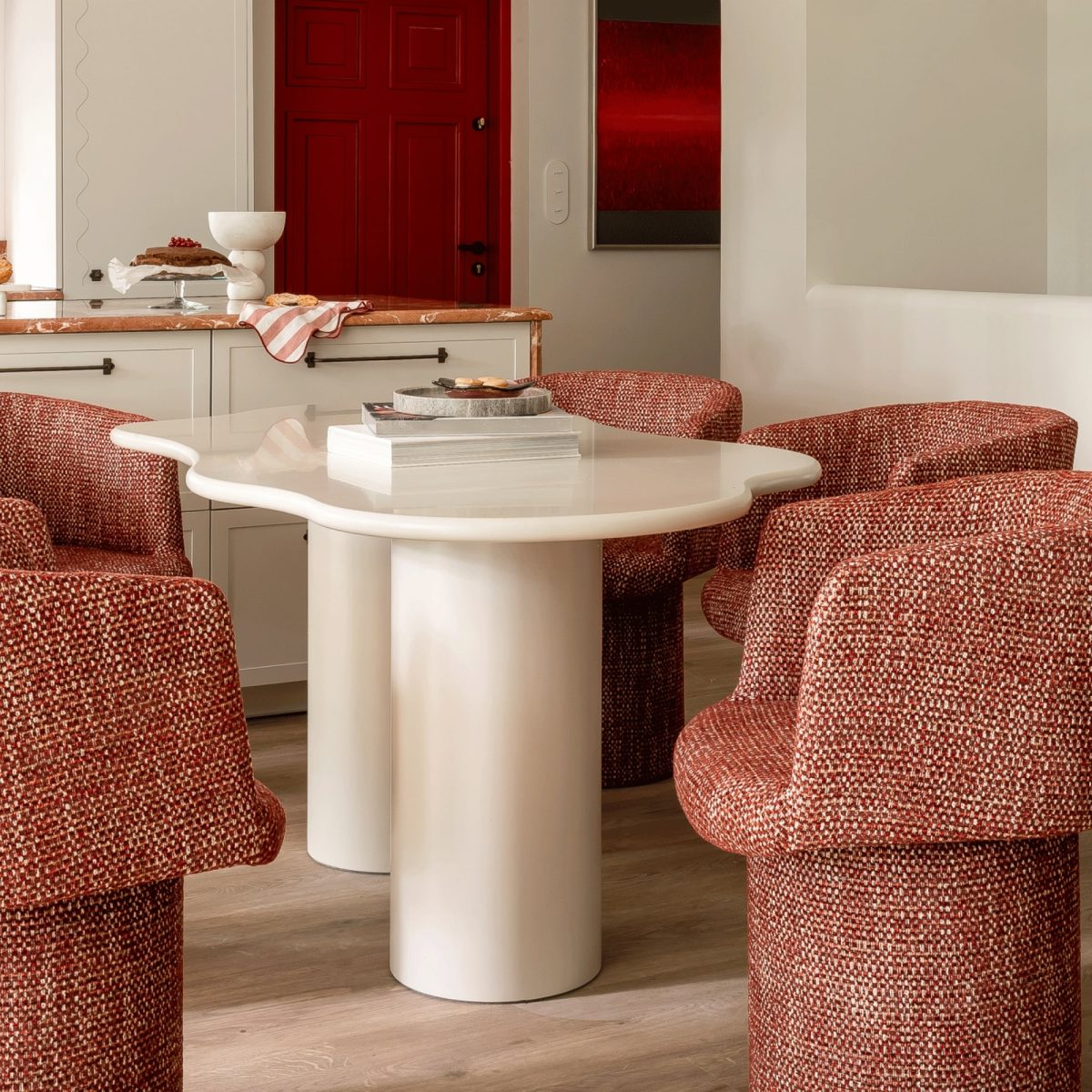Oppdag Pinar – et spisebord som kombinerer moderne eleganse med skulpturell form. Den mykt avrundede bordplaten og subtile gråbeige fargetonen gjør dette bordet til en unik statement i spisestuen. Med sin uvanlige form og solide konstruksjon blir Pinar mer enn bare et møbel – det blir et naturlig samlingspunkt for samtaler og måltider.