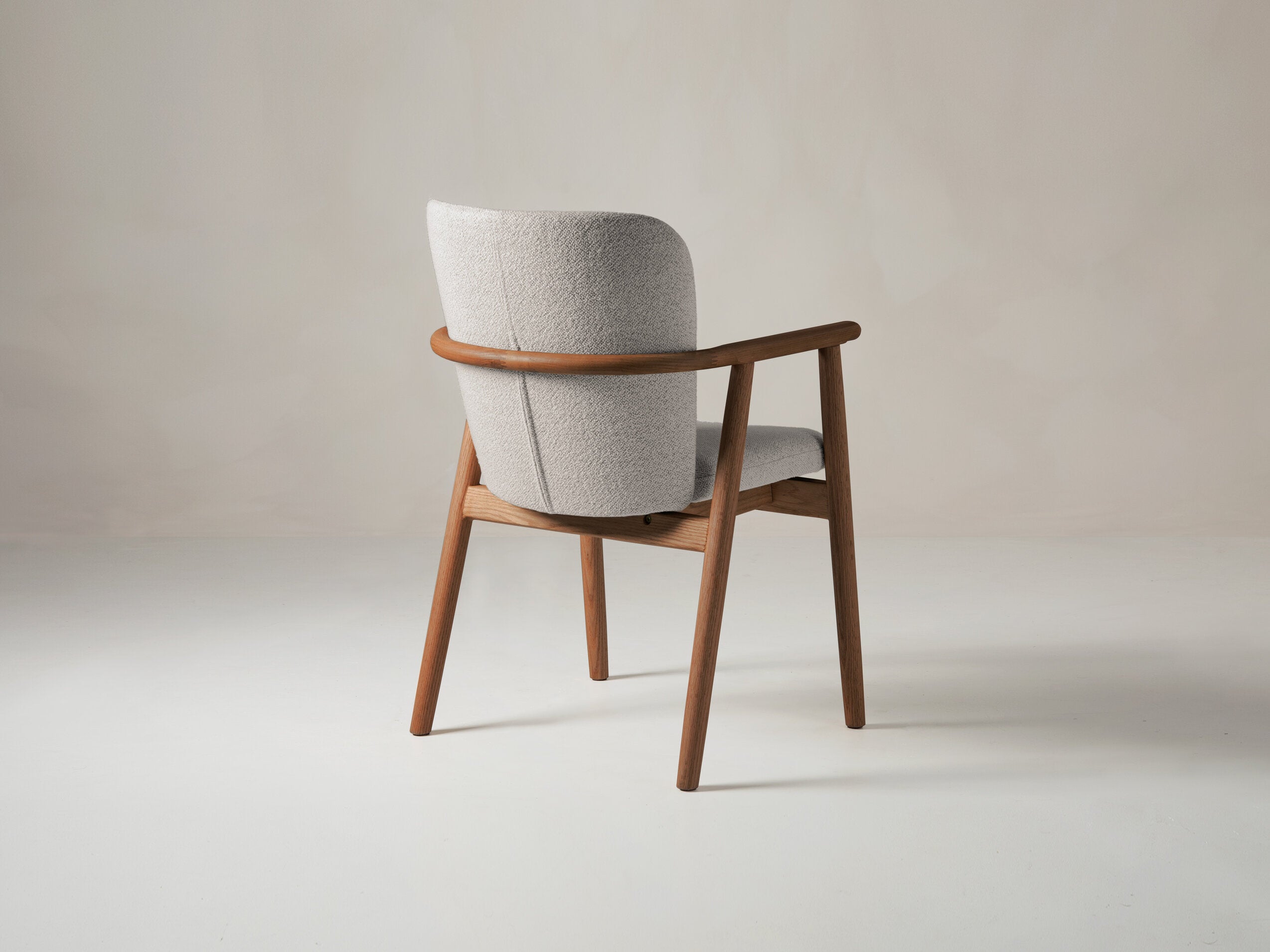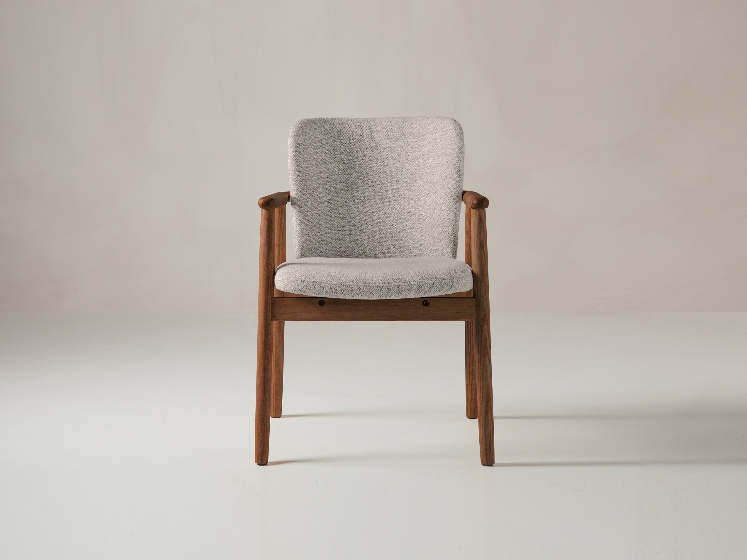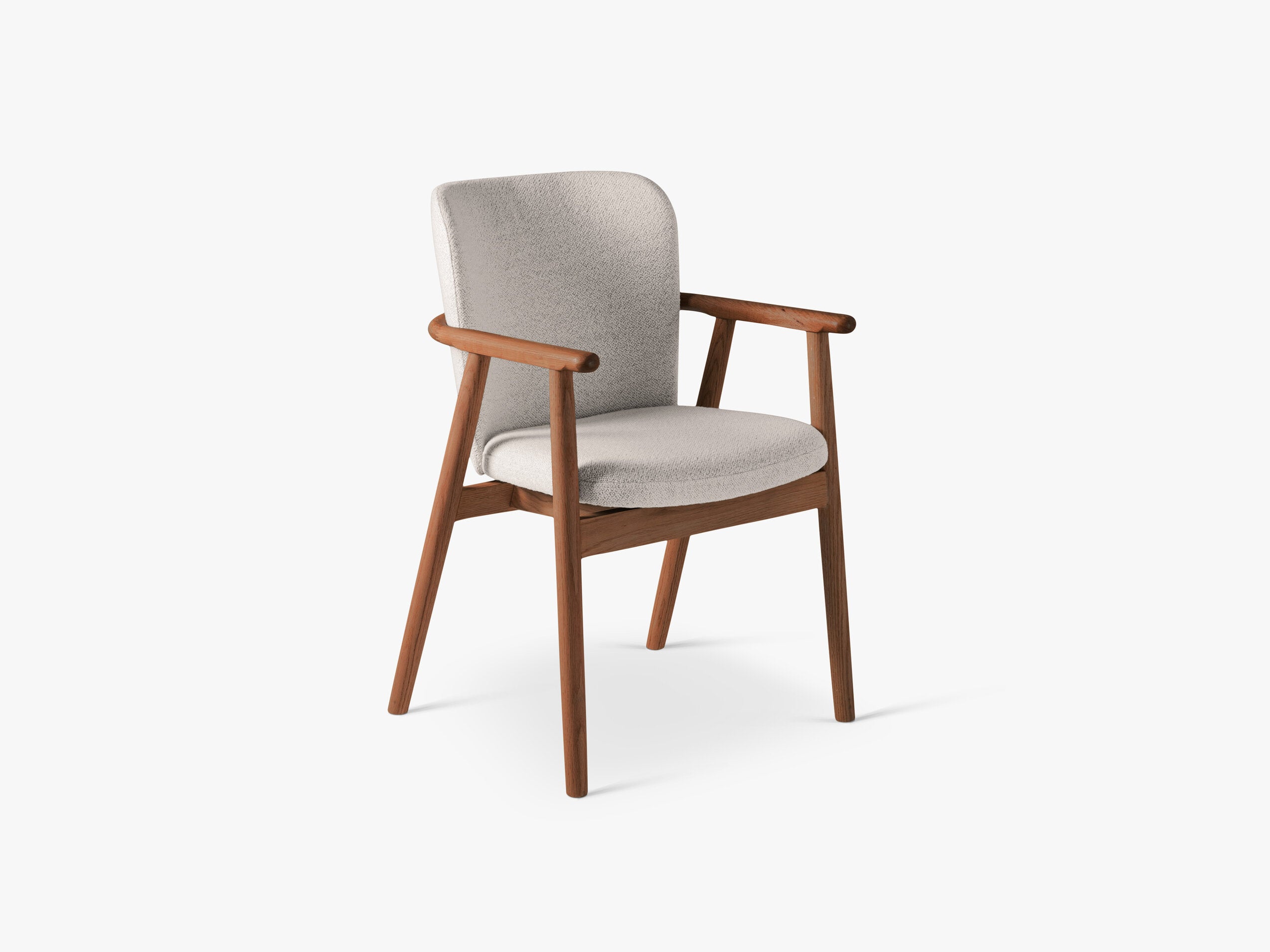 Ria-stolen forener elegansen til en stol og en lenestol. Den tilbyr en komfortabel sitteplass med armlener, mykt bouclé-stoff og en varm valnøttfarge.